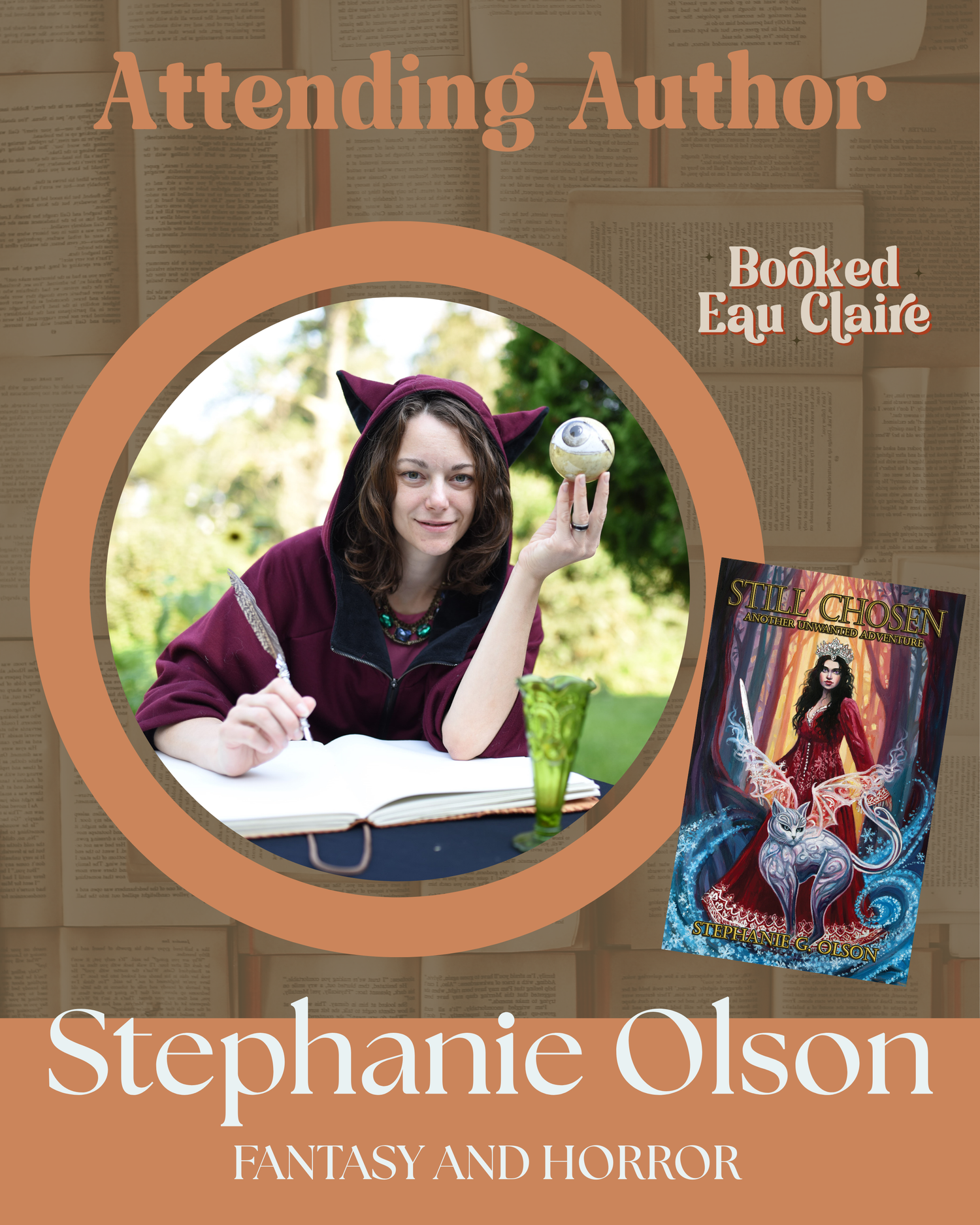 Stephanie Olson (she/her) is a writer, horror movie enthusiast (especially the bad ones), and Halloween-all-year person. The first story she ever wrote was the gripping tale of a haunted bog. It was created in an attempt to scare her bunkmates at summer camp, and the result was so successful she was banned from writing any more stories that week. She’s been chasing that high ever since. While horror is her first love, she also enjoys writing fantasy and mysteries. Stephanie has a short story published in Spontaneous Combustion Volume II, by Sic Semper Serpent, and has written numerous episodes for the horror anthology podcast, Ghost Wax. Her debut novel, Still Chosen: Another Unwanted Adventure, was published in 2025. She lives in Minnesota with her equally talented husband and not-at-all talented dog.